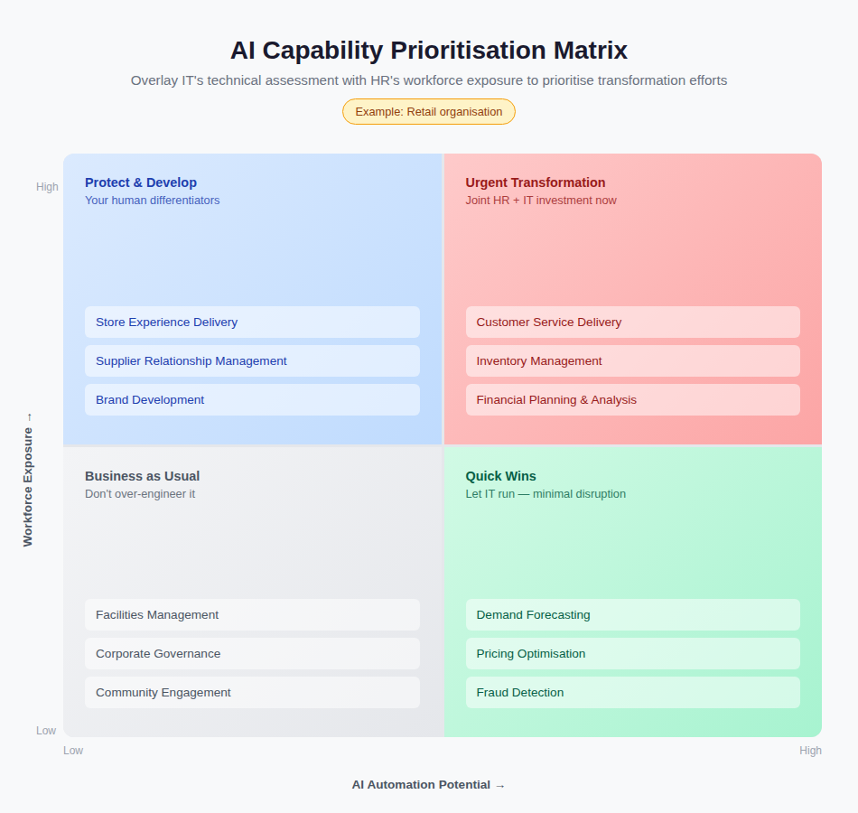 Here's how: take your capability model and overlay two lenses. IT assesses the likelihood that AI can perform each capability (technical feasibility, maturity, data readiness). HR assesses the workforce exposure (how many people, what proportion of their role, what's the reskilling complexity).